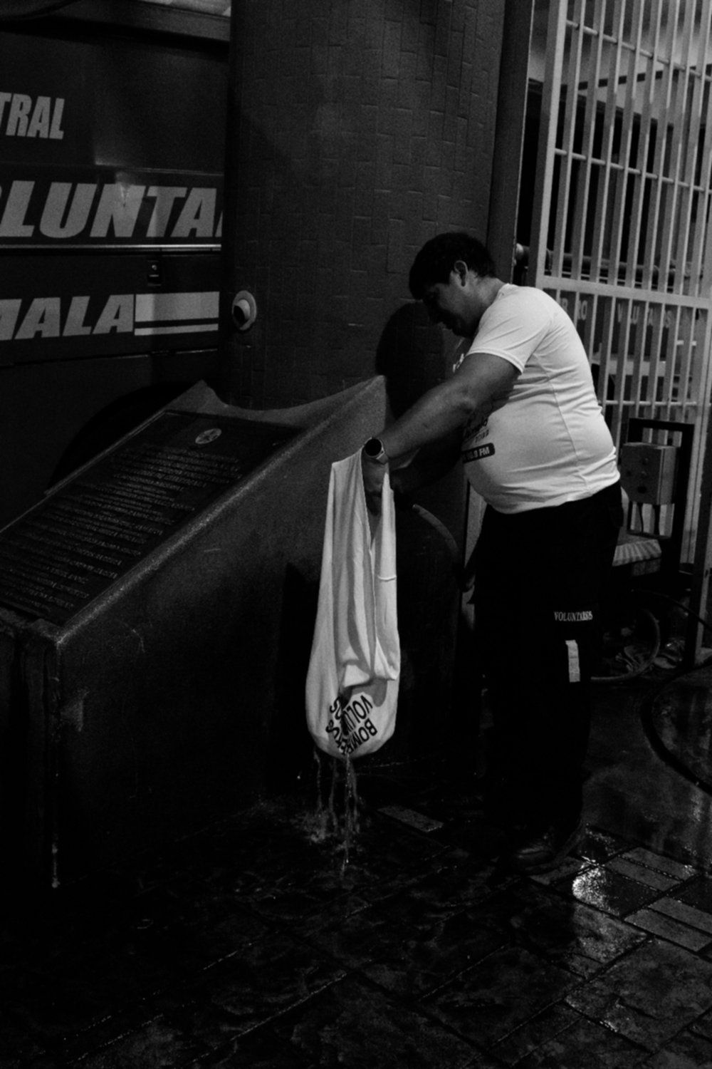El bombero limpia su camisa manchada de sangre al regresar a la estación con una manguera. Crédito: Rolando Alfaro