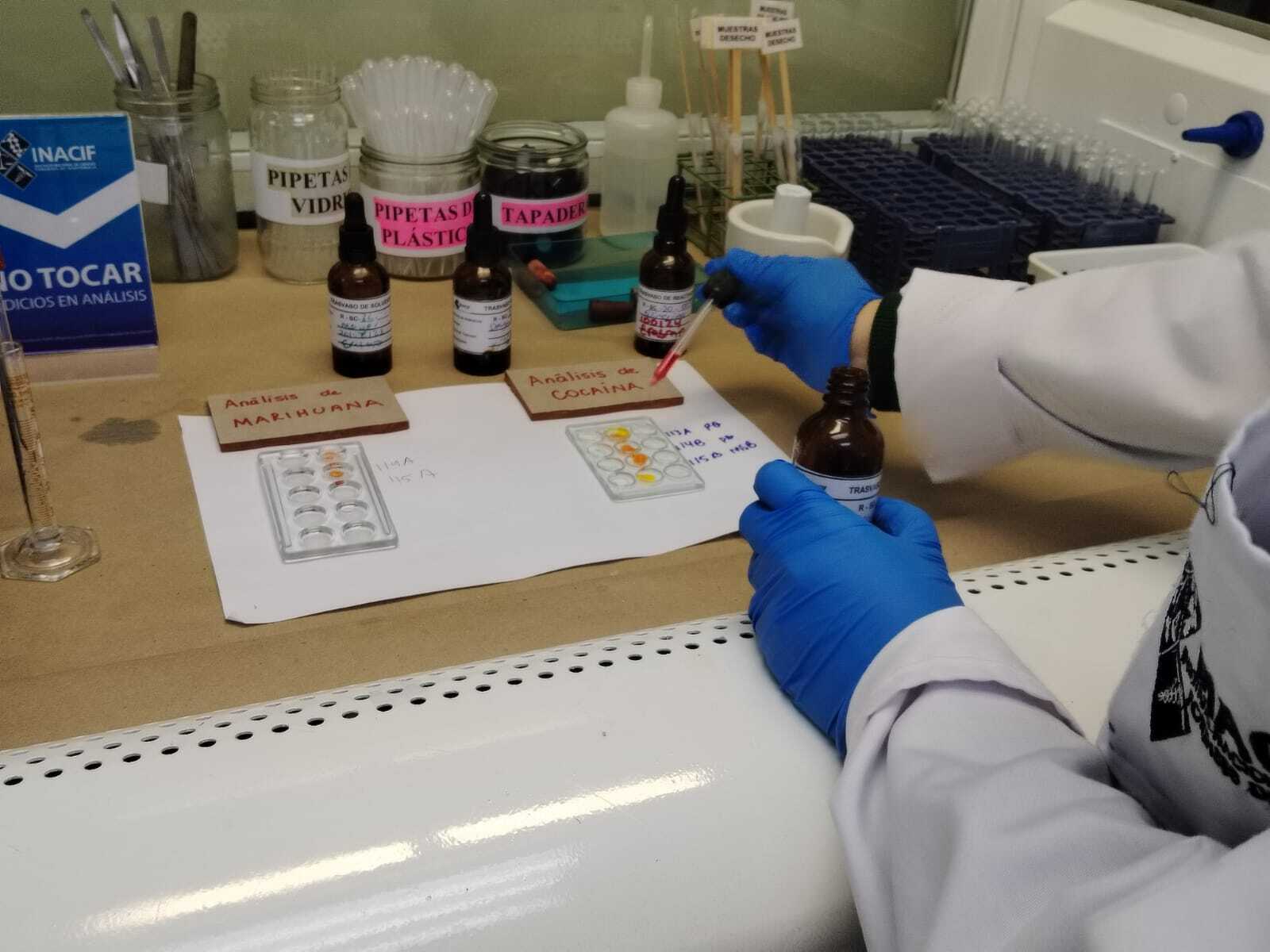 El técnico dividió la muestra en pequeños contenedores y aplicó reactivos químicos. Sobre la placa, el verde se transformó en púrpura. El color encendió la confirmación: cannabinoides.