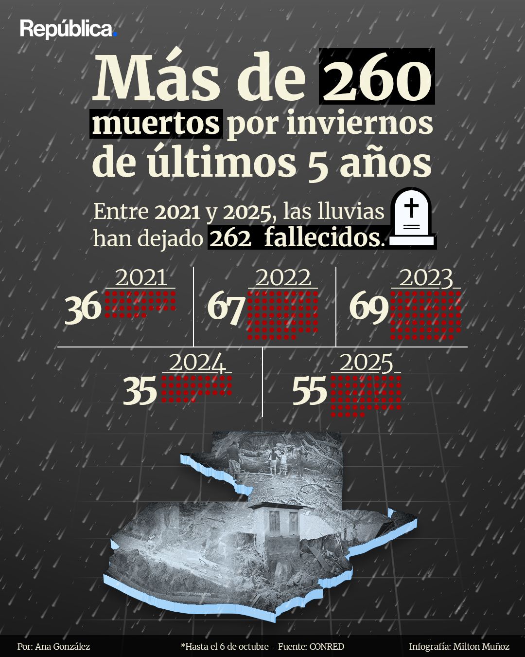En cifras. Entre 2021 y 2025, las lluvias han dejado 262 fallecidos en Guatemala. Los datos de la CONRED muestran cómo cada invierno repite su impacto mortal en distintas regiones del país.